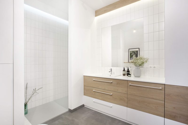 Najlepsze efekty daje oświetlenie warstwowe — główne sufitowe, punktowe przy lustrze i delikatne LED-owe akcenty.
